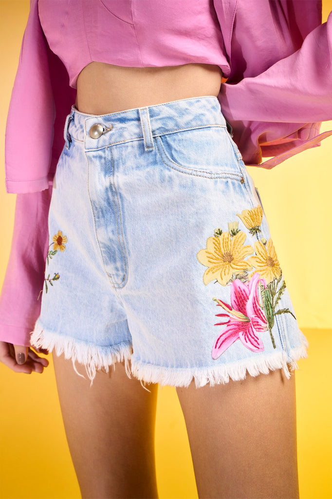 Short confeccionado em jeans de lavanderia clara. A peça possui cós com passantes aplicados, pala na parte posterior e dois bolsos tradicionais, além de bolsos decorativos na parte frontal. A abertura é feita por zíper e botão de metal. Destaca-se pelas aplicações em patchwork floral, que tornam qualquer look mais estiloso e único.