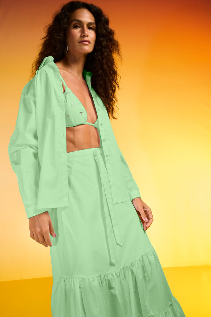 Top biquíni confeccionado em tecido plano algodão paper. Possui bojo e alças ajustáveis por reguladores para maior conforto, além de amarração com laço posterior. O destaque fica por conta da aplicação de cristais, que garantem pontos de luz ao look. Dica de look: Combine com a camisa City Blue de conjunto, no mesmo material do top, para uma produção descolada e cheia de estilo!