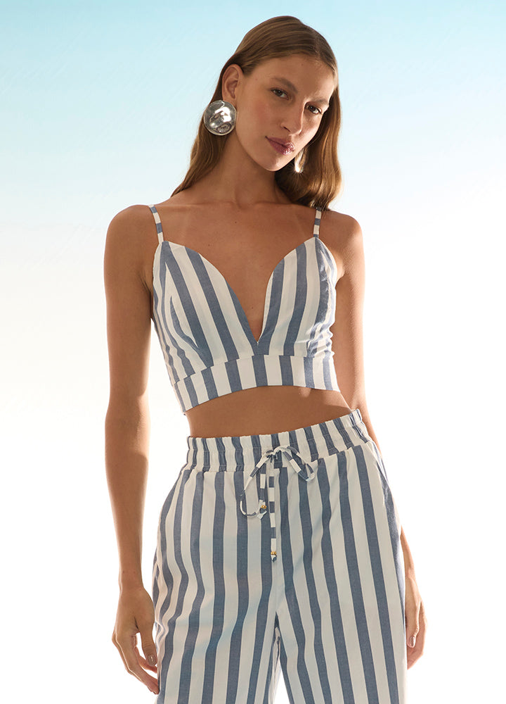 Top confeccionado em tecido plano com listras largas. Com alças reguláveis e lastex na parte posterior, ele garante um ajuste perfeito ao corpo, enquanto a camada dupla evita transparências, proporcionando segurança e sofisticação. Versátil, pode ser combinado tanto com peças casuais quanto mais refinadas. Para um visual urbano e chic, combine com a calça wide leg listrada de conjunto da coleção.