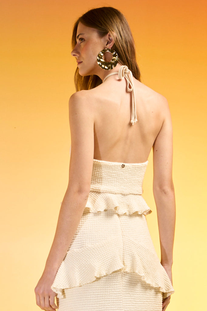 Top confeccionado em malha tricot com elastano. Conta com forro e elástico no decote para maior conforto e segurança ao vestir. Destaque para o detalhe luxuoso da estrela de metal dourado na parte frontal e alças para amarração nas costas em cordão natural.