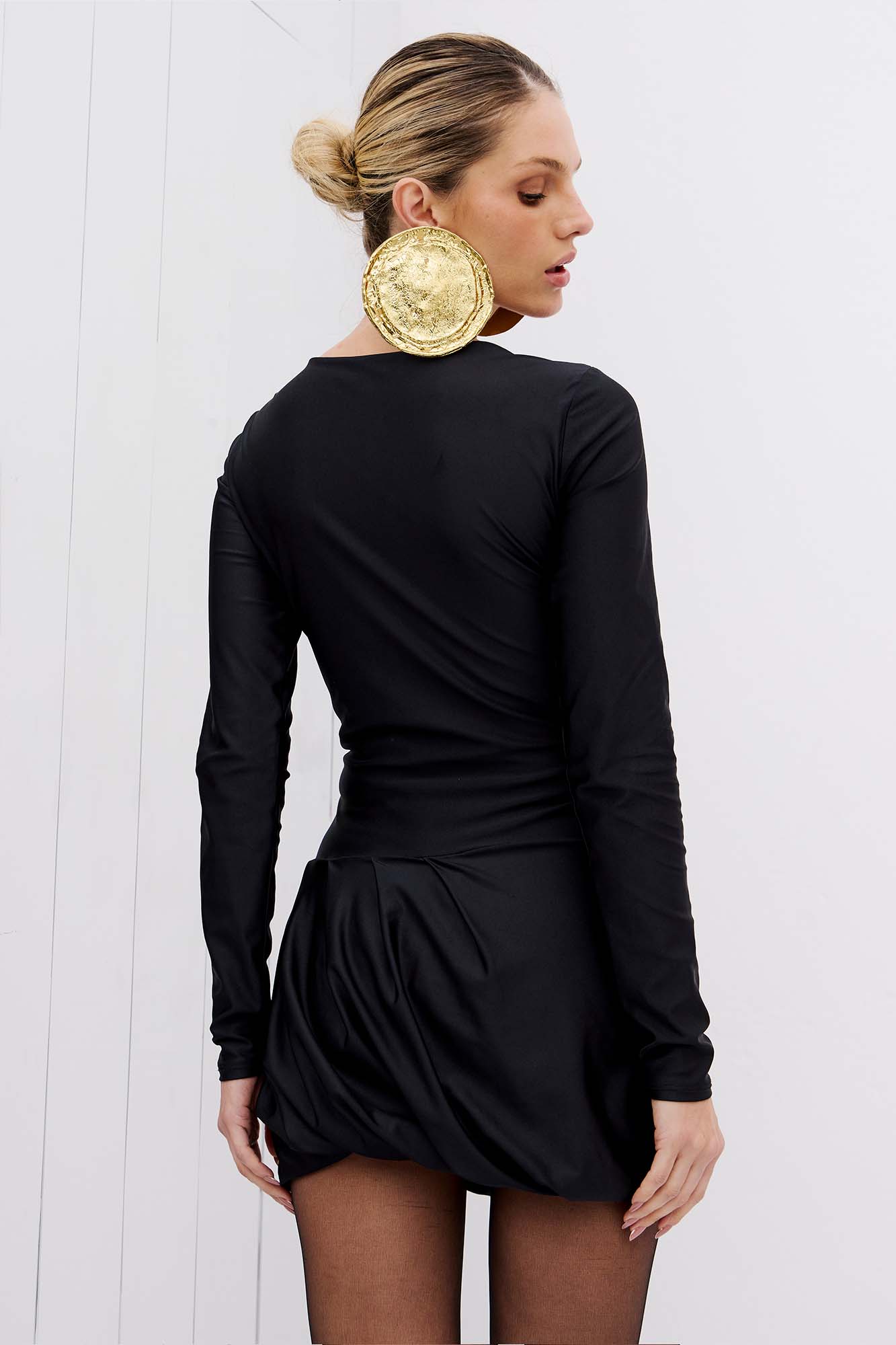 Vestido curto confeccionado em malha shiny e forro com elastano, oferecendo conforto e flexibilidade. A barra balonê com drapeados cria movimento e um toque moderno. Dica: Combine com acessórios de strass e sandálias de salto para um visual noturno e sofisticado. 78% POLIAMIDA 22% ELASTANO.