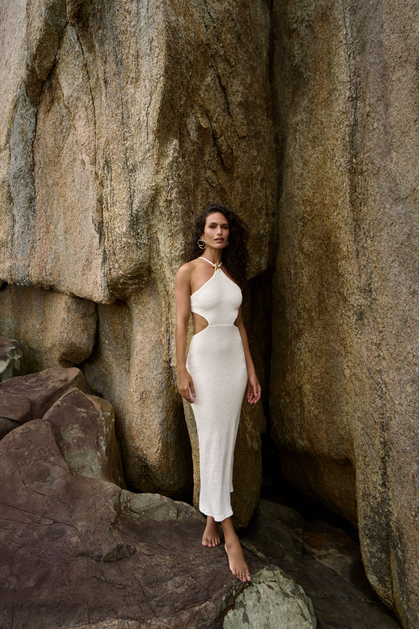 Vestido confeccionado em malha tricot com elastano. Conta com forro para maior conforto e segurança ao vestir. Destaque para o detalhe luxuoso da estrela de metal dourado na parte frontal e alças para amarração nas costas em cordão natural. Combine com acessórios dourados para um visual sofisticado.