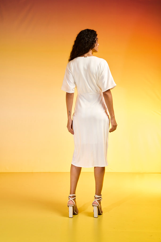 Vestido confeccionado em tecido plano de padronagem listrada com acetinado sutil, proporcionando sofisticação e conforto. O forro garante maior comodidade, enquanto o transpassado com amarrações laterais e a manga morcego trazem um toque de leveza e movimento ao visual. Dica de look: Combine com sandálias de salto e acessórios dourados para um visual moderno e chic.